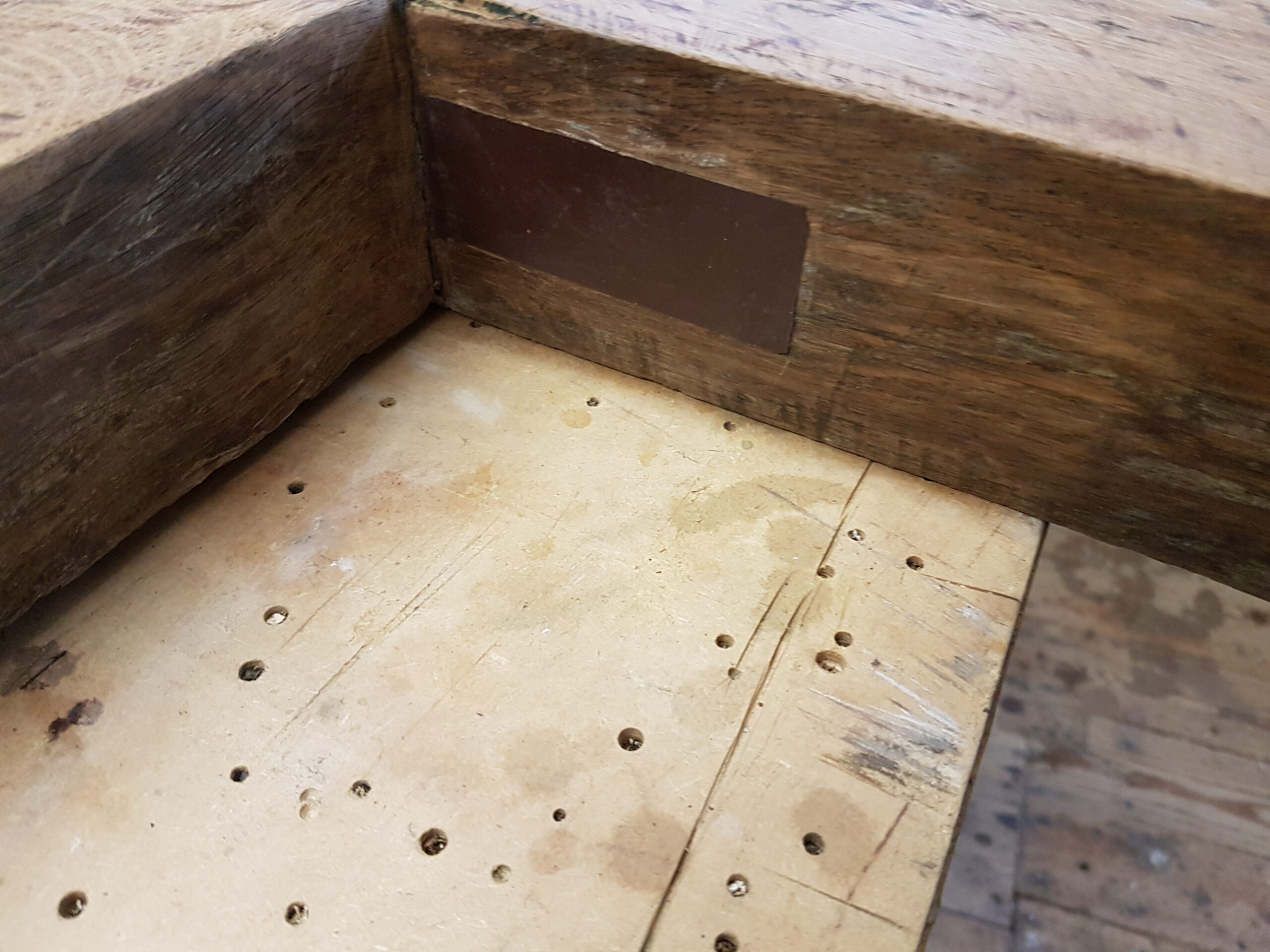 Die bei diesem Zigarrentisch vorhandene Tischplatte ist nach der Nutzung erneuert worden. Die ursprüngliche Platte war nach der jahrelangen Nutzung als Unterlage zum Schneiden des Tabaks zu stark verkratzt. Die neuere Platte zeigte bereits große Risse und Blessuren, so dass diese zu Schublade umgebaut wurde. So blieb sie dem Tisch in anderer Funktion erhalten. Die neue Tischplatte ist aus Nussbaum furnierter Tischlerplatte mit profiliertem Massivholz Anleimer gefertigt. Da die Zargen des Tisches ebenfalls deutliche Gebrauchsspuren aufwiesen, wurden diese auch mit Nussbaum Starkfurnier (2mm dick, üblich sind 0,5mm) belegt. Die Tischbeine wurden abgelaugt. Die Oberflächen sind geölt. Somit hat der Tisch eine pflegeleichte und schützende Konservierung. Die Familie, deren Vorfahren an diesem Tisch Zigarren hergestellt haben, nutzt den Tisch heute für Schreibarbeiten.
