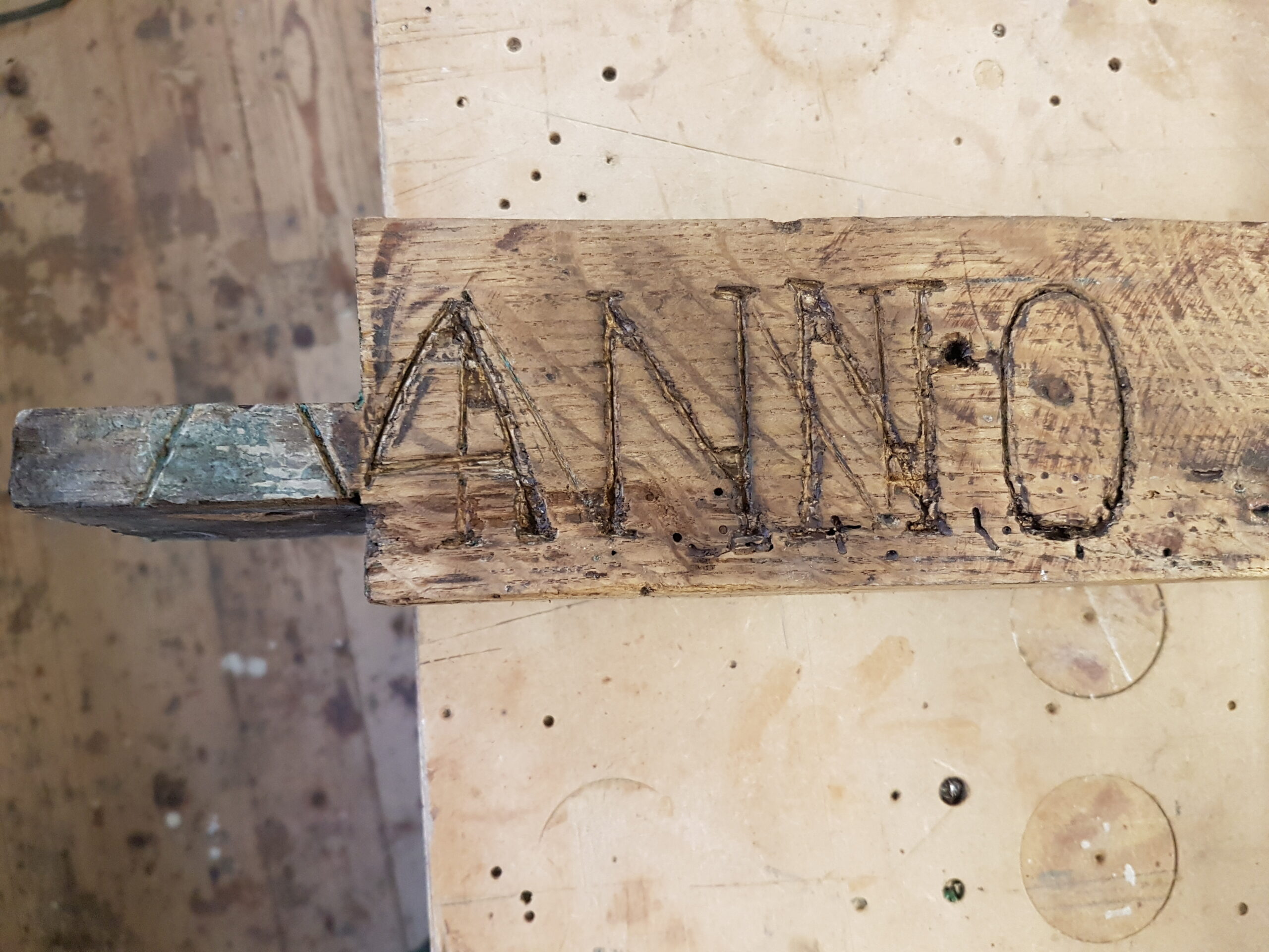 Die ursprüngliche Inschrift „ANNO“ wurde in die neue integriert. - Im oberen Teil des Kreuzes kamen Initialen zum Vorschein. Mutmaßungen zu Folge sind diese vom Tischler.