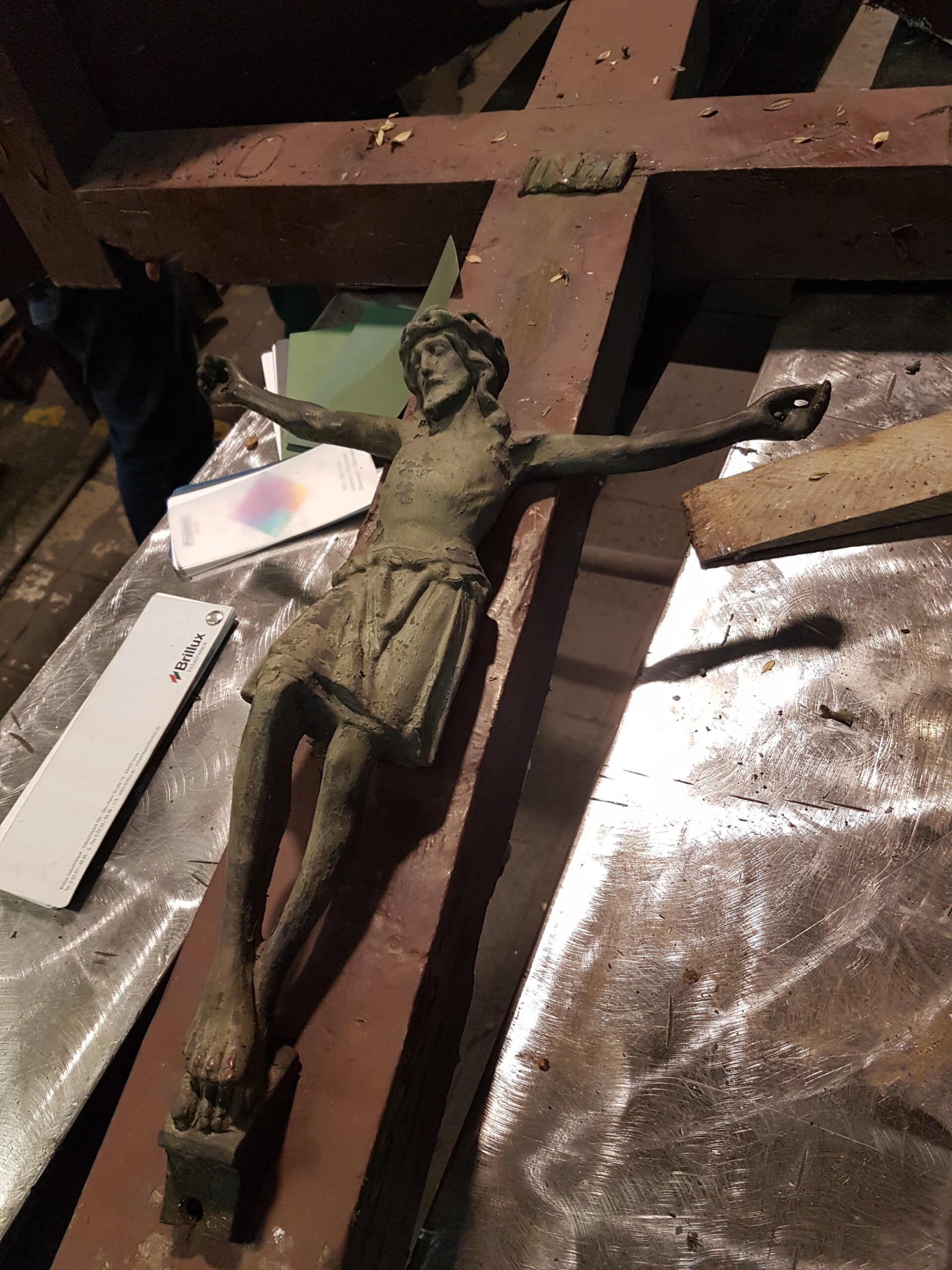 - Nach Abnahme des Kruzifixes kam die Plakette mit der Gravur INRI zum Vorschein. Auch diese konnte erhalten werden.