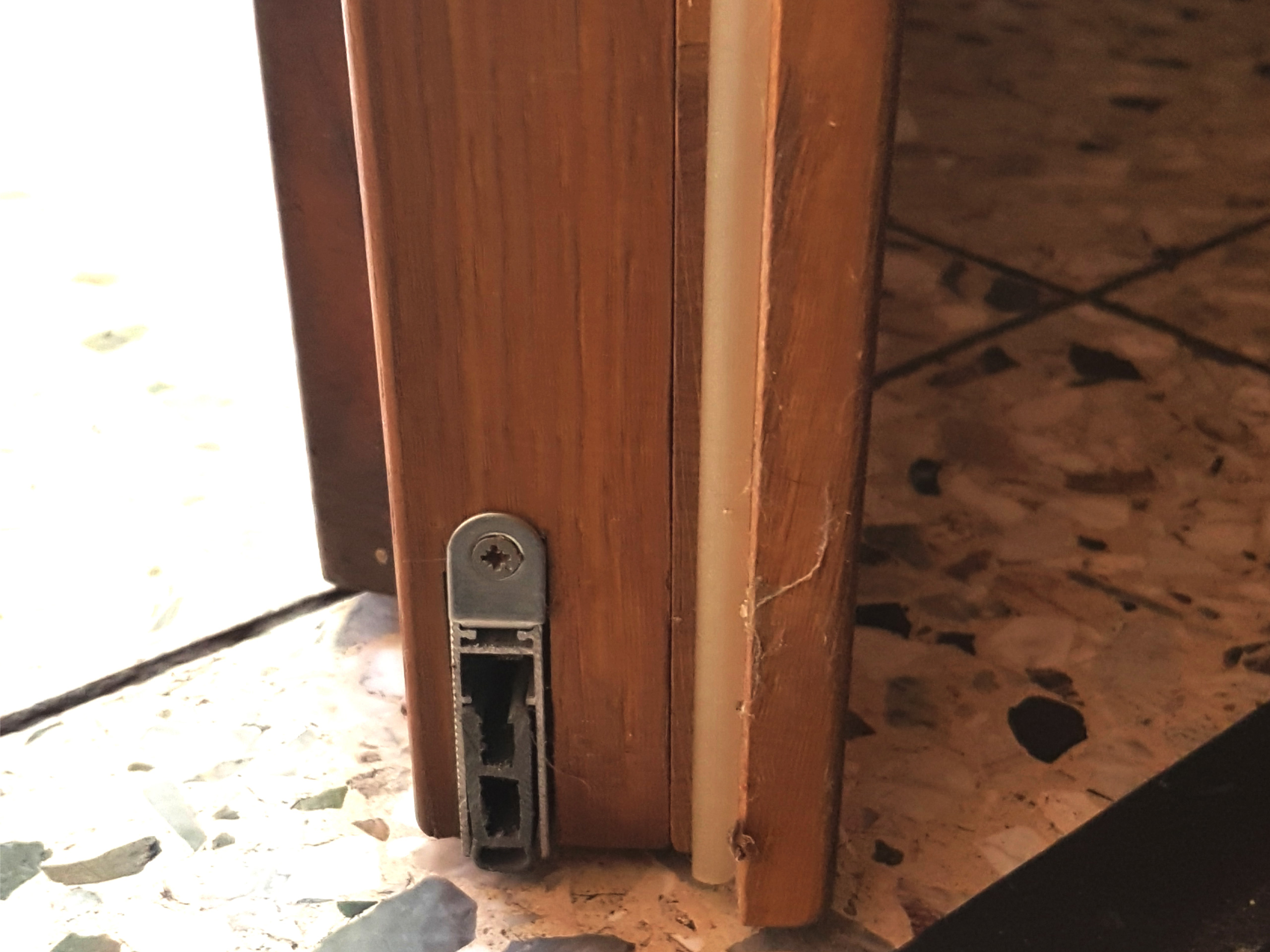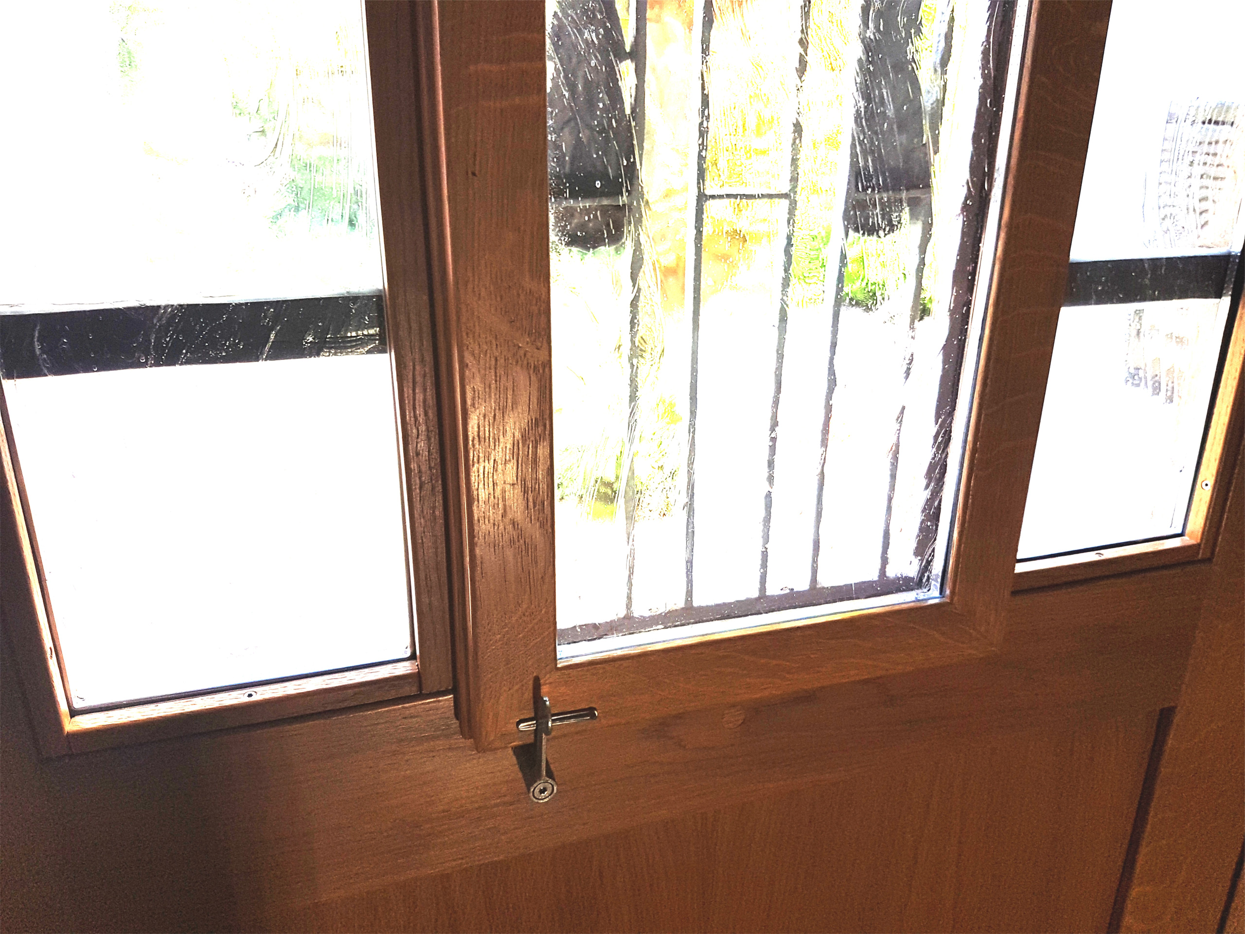 Im Bereich energetische Ertüchtigung wurde das Sammelsurium von einfachen Scheiben durch historisch anmutendes Isolierglas ersetzt. Eine umlaufende Schlauchdichtung wurde eingesetzt und zusätzlich der Türaufschlag außen verbreitert. Ebenfalls wurde unten in der Tür eine absenkbake Dichtung eingebaut. Somit ist die Tür heute besser Isoliert und Zugluft dicht.