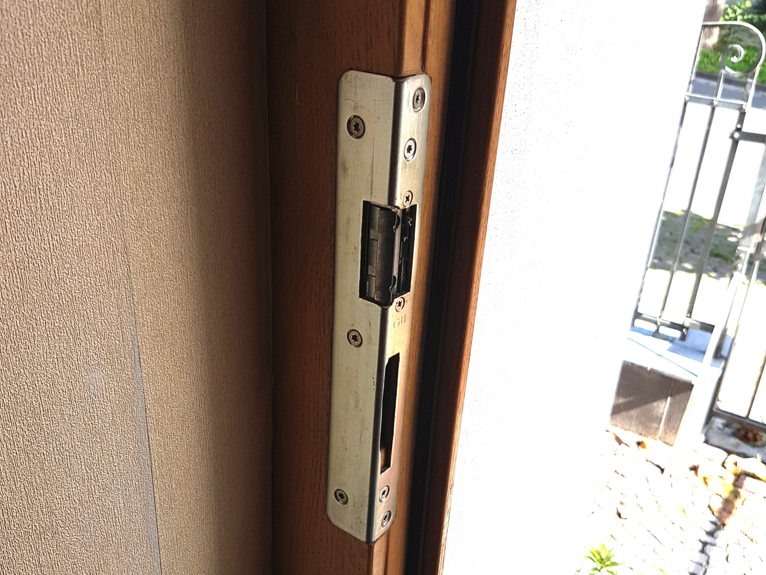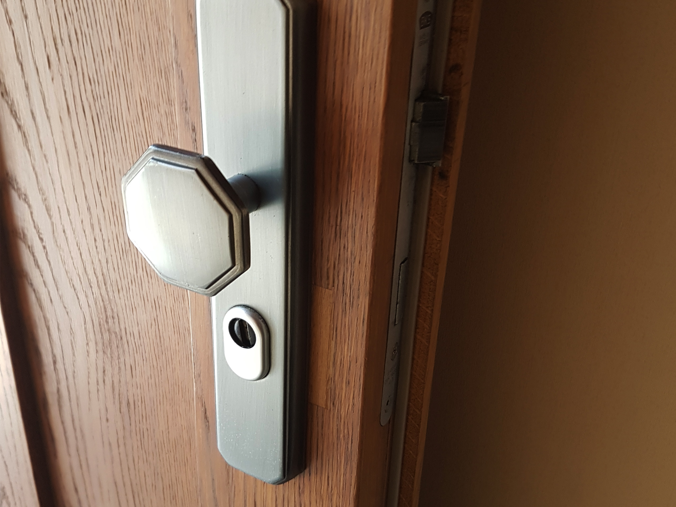 Für eine verbesserte Sicherheit wurde das alte Schloss durch eine neue Wechselgarnitur mit Aufbohrschutz in antiker Optik ersetzt. Das alte Schließblech aus dünnem Material wurde durch einen Winkel-Sicherheitsbeschlag ersetzt.