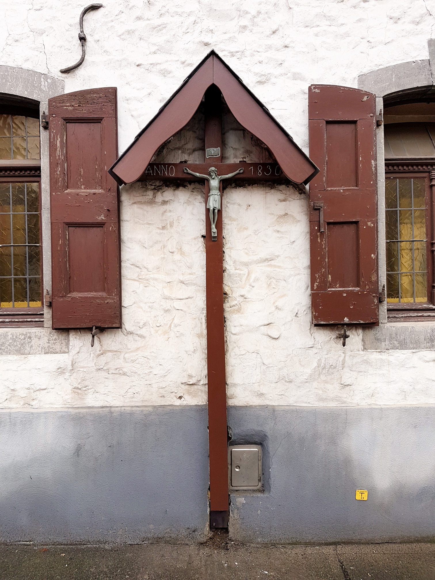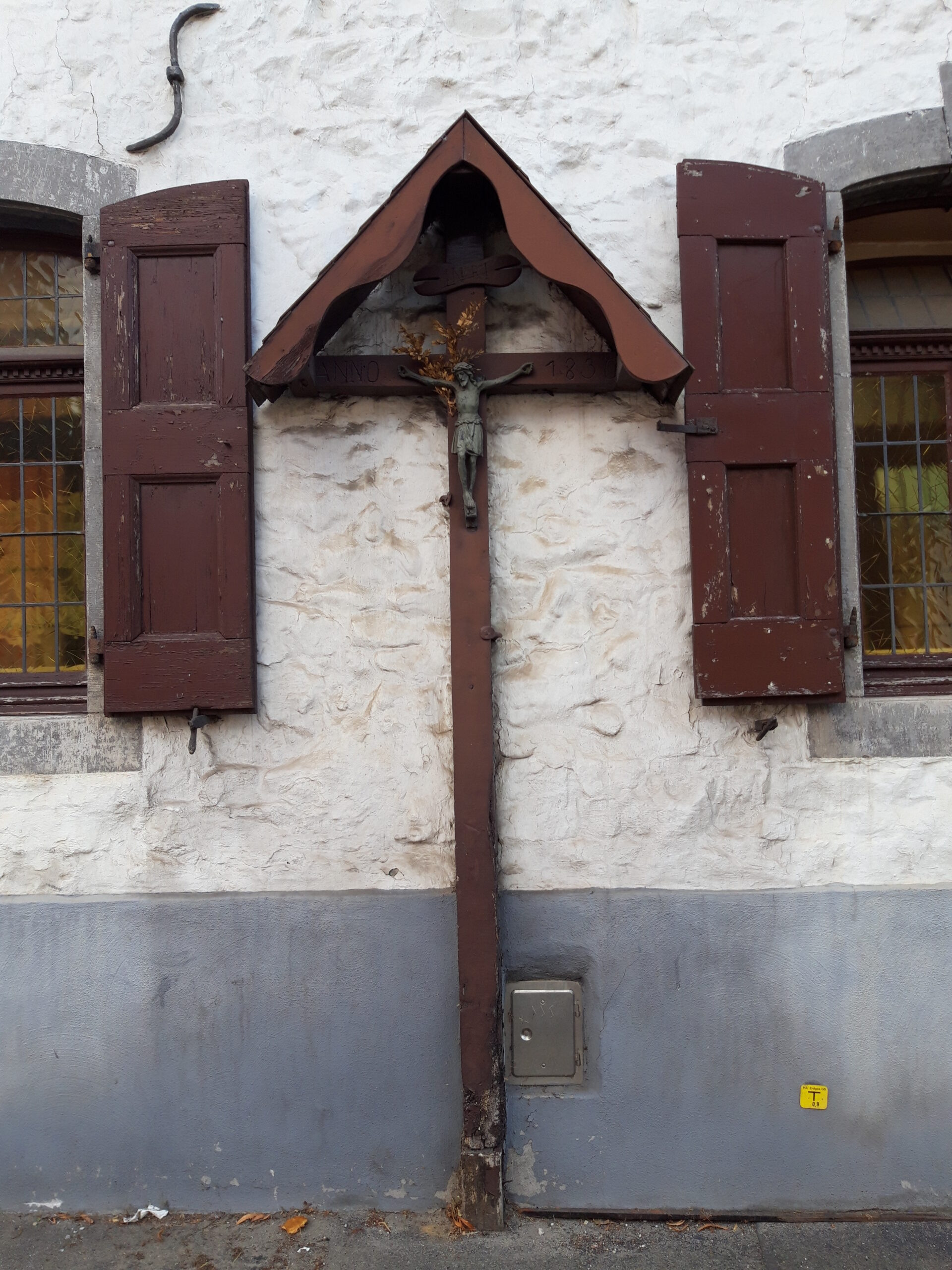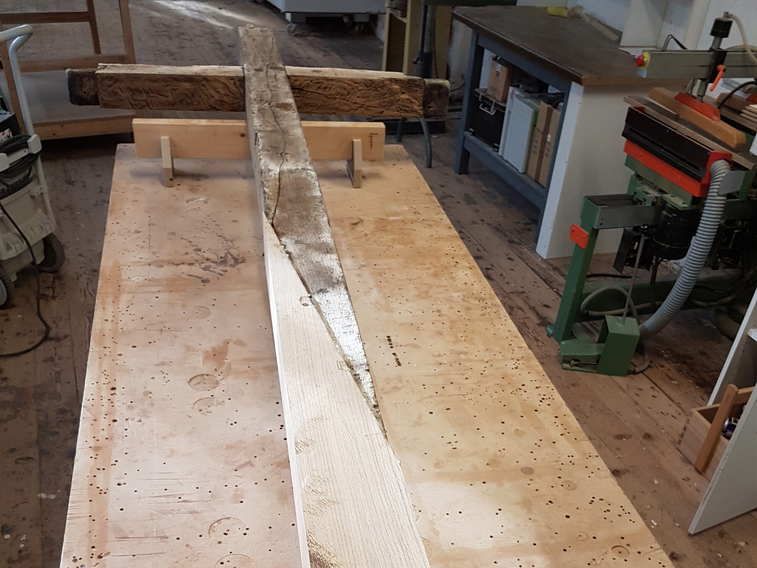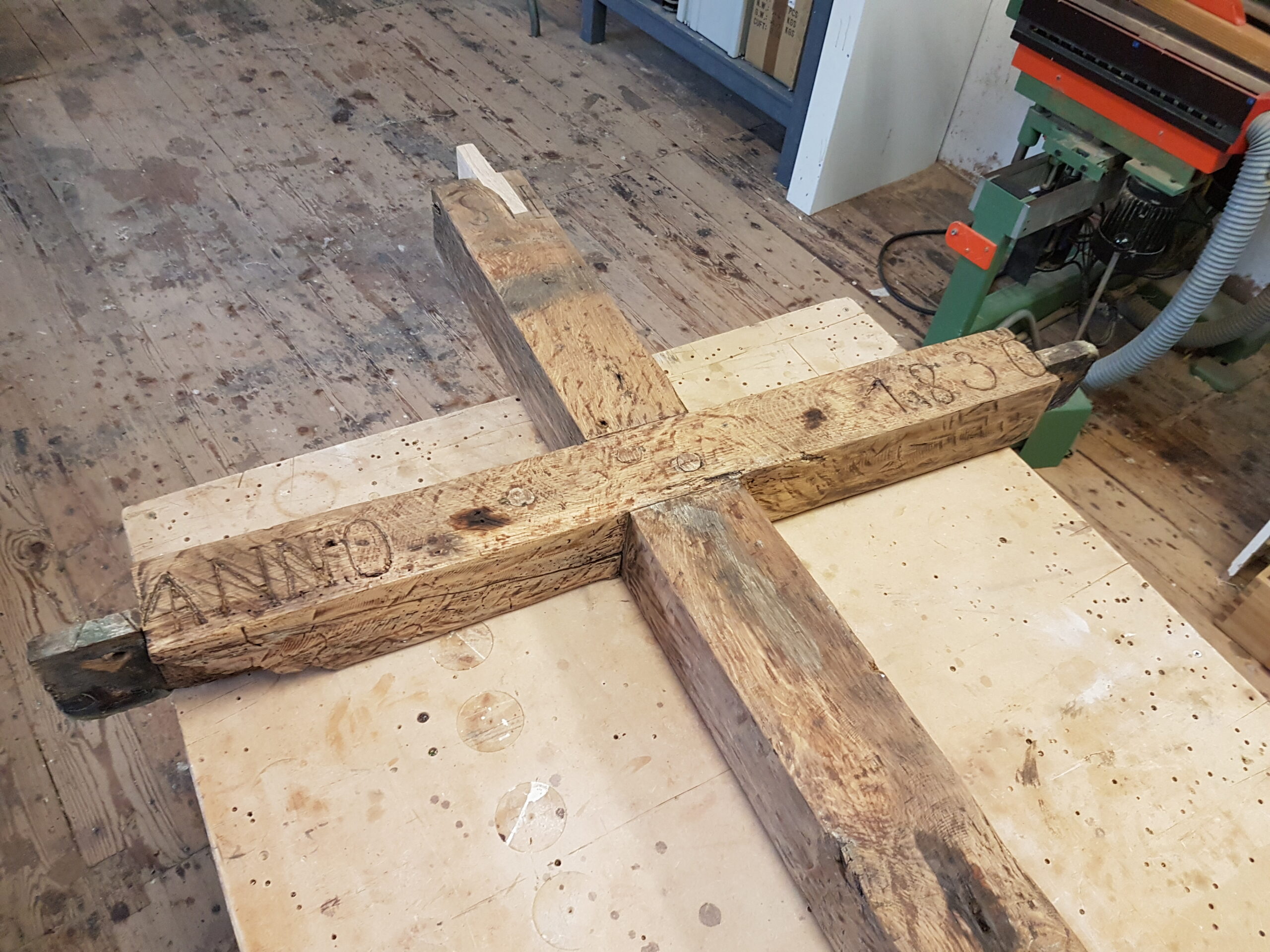 Restaurierung eines Wegekreuzes (Eiche lackiert) in Würselen, erbaut 1830. Der untere Teil des Kreuzes war bereits zu stark verwittert. Um so viel wie möglich der Originalsubstanz zu erhalten, wurde der untere Teil mittels schrägem Anschnitt erneuert. Der wichtigste Teil des Kreuzes und das Kruzifix konnten erhalten werden.
